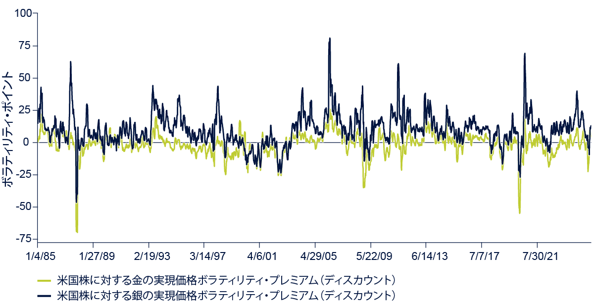 注:S&P500指数に対する金と銀の週次の30日実現スポット価格ボラティリティ。過去のパフォーマンスは将来のパフォーマンスの信頼できる指標ではありません。