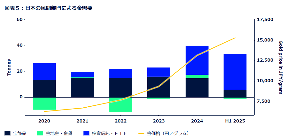 日本では、2020年から2024年までの経済環境が金の需要動向を形成する上で重要な役割を果たしました。持続的な円安、2022年以降の国内インフレ率の加速、前例のない地政学的リスクを背景に、家計はこれらのリスクをヘッジできる伝統的な資産に逃避先を求めました。