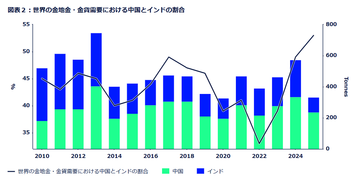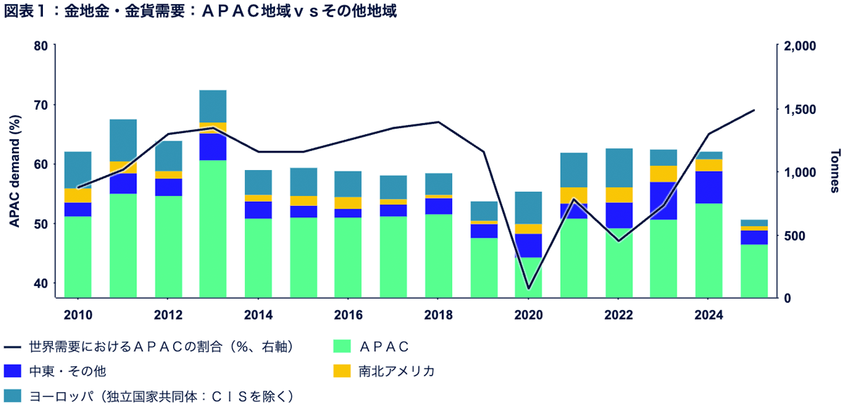 図表1は、2010年から2025年上半期までの金地金・金貨の世界需要を示しています。この期間に、世界全体の需要に占めるAPAC地域の割合が大きく変動しました。2020年には、パンデミックに関連する混乱や投資家行動の変化の影響を受けて急激に低下し、APAC地域の寄与度はわずか39%まで急低下しました。
