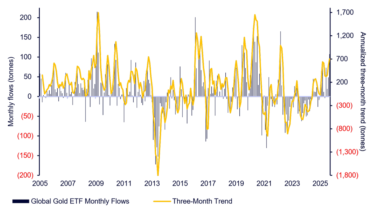 ・2025年の金ETFへの資金流入は2000年以来の高水準となっており、2025年9月の月間流入額は米ドル建て名目額ベースで過去最高を記録しました※10。しかし、トン数ベースの総保有量は依然としてパンデミック時のピークを下回っています。これにより、たとえ金ETFの買いがコンセンサストレードだとしても、金の保有が過剰ではないことが示唆されます。