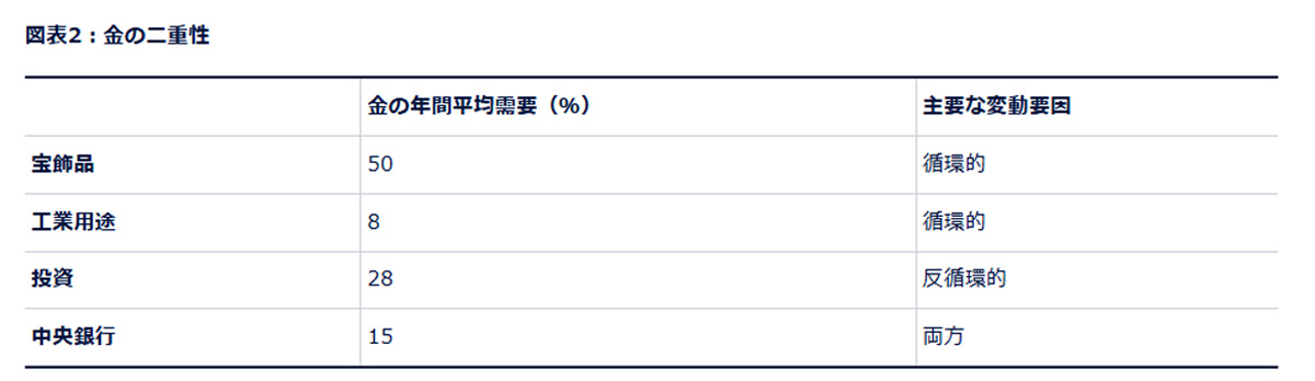 金は伝統的なコモディティや通貨として分類されることが多いものの、経済サイクルに全体にわたるさまざまな需要源により、他の実物資産やフィアット(法定)通貨との違いは際立っている。この特性は、金を独立したオルタナティブ資産クラスとみなし、投資ポートフォリオにおいて独自に配分されることを正当化する根拠となっている。