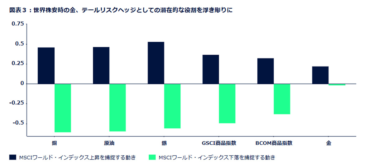 原油、銅、さらには銀といった主要コモディティでさえ、歴史的に⾦よりも景気に影響されやすく、市場や景気のサイクルとの連動性が⾼い傾向にあります(図表3)。その理由は、これらのコモディティへの需要は景気循環に沿った消費の影響を受けやすいからです。つまり、グローバル株式や経済の上昇時にはそれを上回る可能性もあれば、株価や経済の下落時にはより⼤幅に下落する場合があることを意味します。