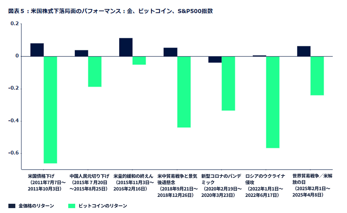 リスク分散効果とリスク調整後リターンに基づくと、特に市場下落局⾯において、ビットコインはこれまでの実績に基づくと⾦に匹敵するような利点は⾒当たりません(図表5)。