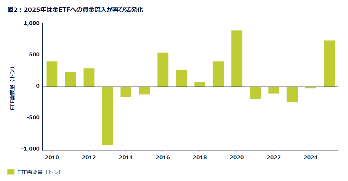 2025年第3四半期の金の現物需要は、過去最高水準の金価格にもかかわらず前年比3%増加し、史上最高を更新しました。この堅調な動きは、ETF投資家、地金・コイン購入者および中央銀行の需要によって支えられ、価格に敏感な宝飾品需要の弱さを相殺しました。特に新興国の中央銀行は構造的な需要源としての役割を維持しており、第3四半期の買い入れの回復および価格の下支えに寄与しました。2025年通年の買い入れは、年間約1,000トンという近年のトレンドには届かない可能性があるものの、依然として過去最高水準に迫る力強い需要が見込まれます。ETFへの資金流入も引き続き力強く、年初来の流入額は米ドルベースで2020年通年の記録をすでに上回り、トン数ベースでも2020年にほぼ匹敵する水準となっています(図2)。