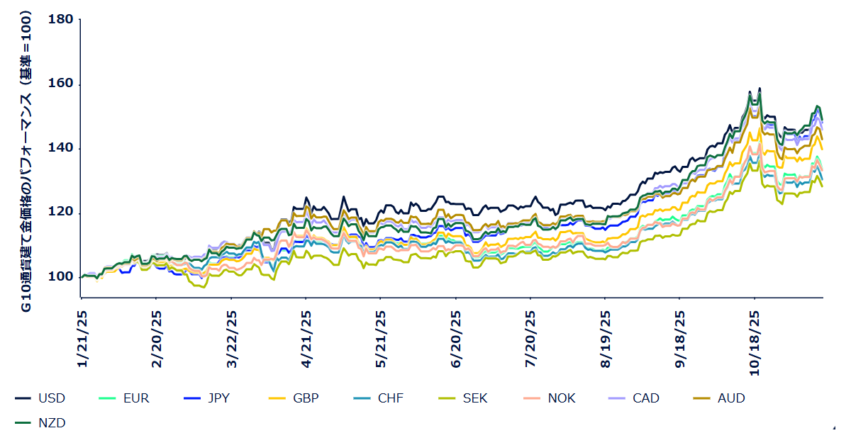 図表2:第2次トランプ政権下で米ドル建て金価格はその他G10通貨建てをアウトパフォーム