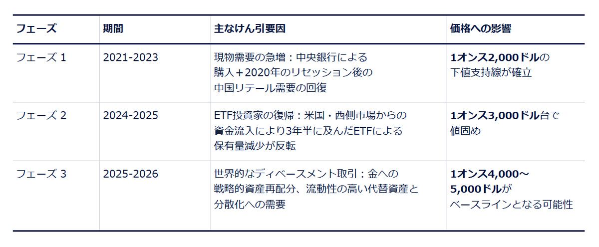 パンデミック後のレジーム変化は、金相場をより高いレンジに移行させています。過去5年間の価格サイクルに着目すると、3つの明確なフェーズがあったことが分かります。