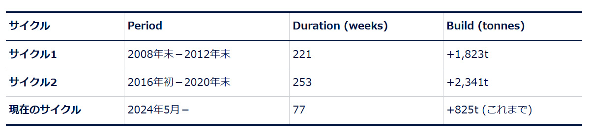 注目すべき点として、現在のサイクルの持続期間は過去のサイクル1の35%、サイクル2の31%、金保有増加量は同45%、35%に相当します※15。