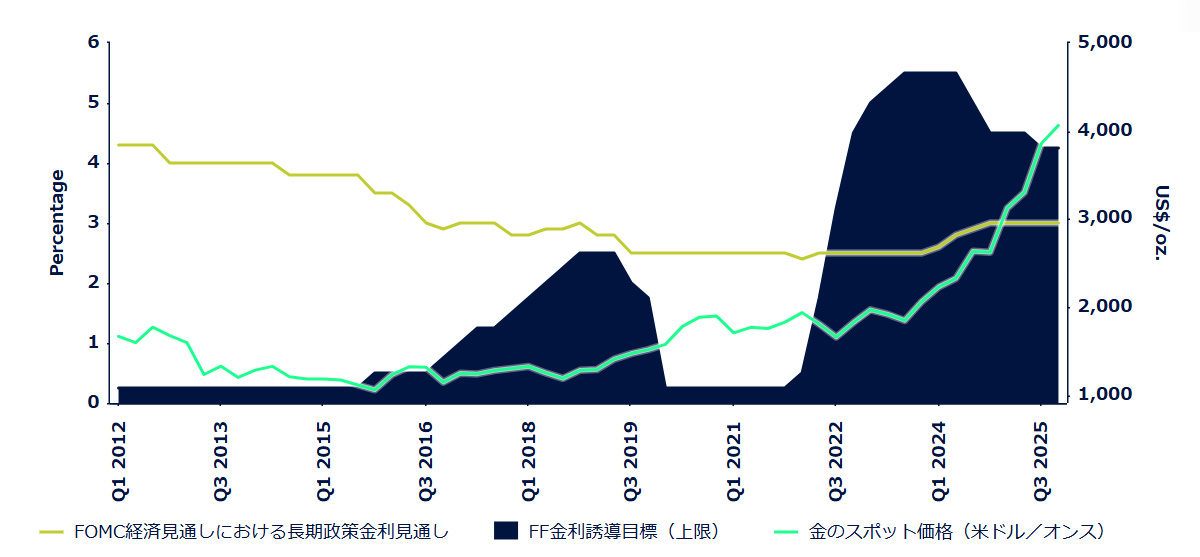 これは、FRBが利下げを進めるなかでもタームプレミアムが上昇する可能性があることを意味します。この政策ミスマッチ(長期ゾーンの引き締まりと短期ゾーンの緩和)は、FRBが金融環境を安定化させるためにより積極的に利下げを行う後押しとなる可能性があります。そうした環境は実質利回りを低下させ、価値保存手段としての金の役割を強化する傾向にあります。