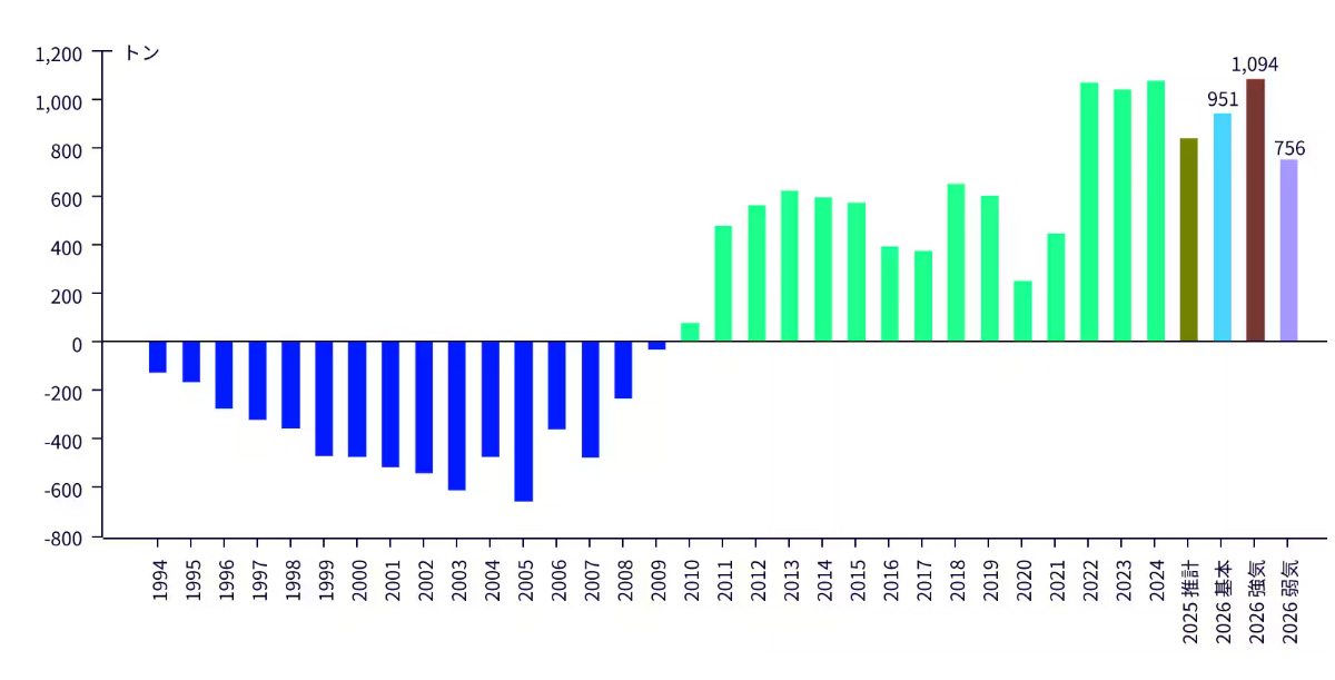 過去の平均ペースである約8.75トン/週に基づくと、2026年のランレートごとの流入量は以下のように推定されます: