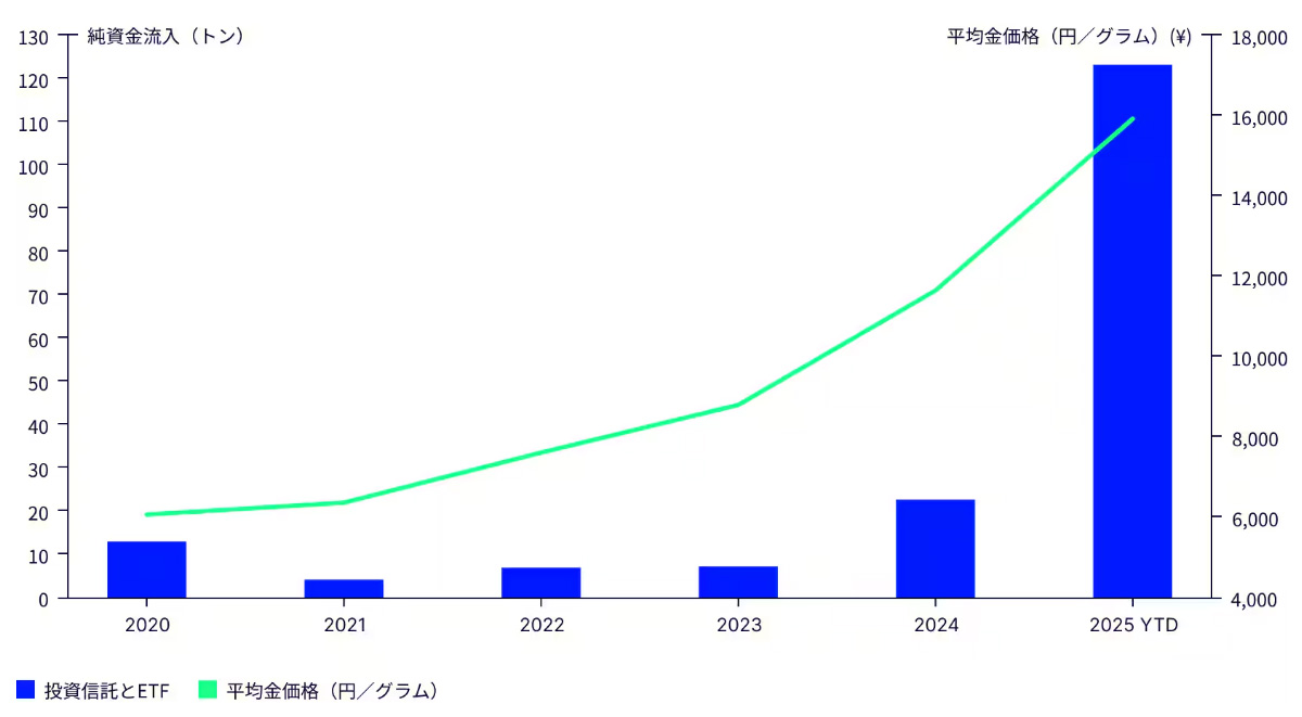 宝飾品需要は弱いものの、家計と機関投資家が円安とマクロ不確実性に対するヘッジを講じるなか、投資経路(特に投資信託とETF)を通じて金への旺盛な資金流入が見られています。金価格が記録的高水準にあるにもかかわらず、日本籍の金投資信託およびETFは2025年初来で金123トン分の純資金流入を記録しており、これは2024通年の5.5倍に相当します※36。