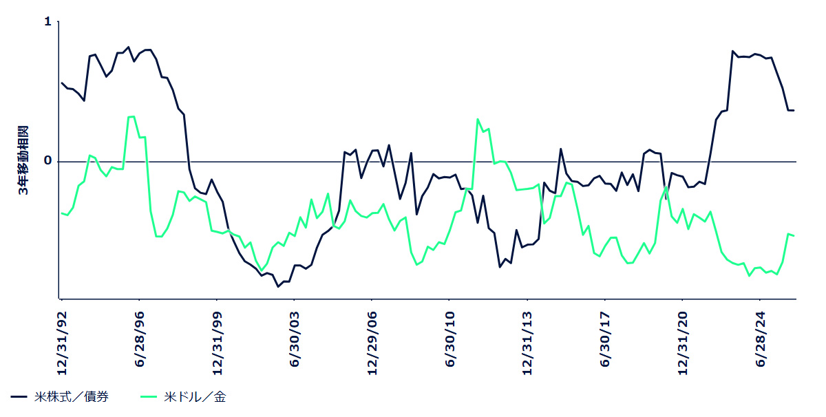 図表1:米国の株式/債券および米ドル/金の四半期ごとの対数正規リターンのローリング3年相関性