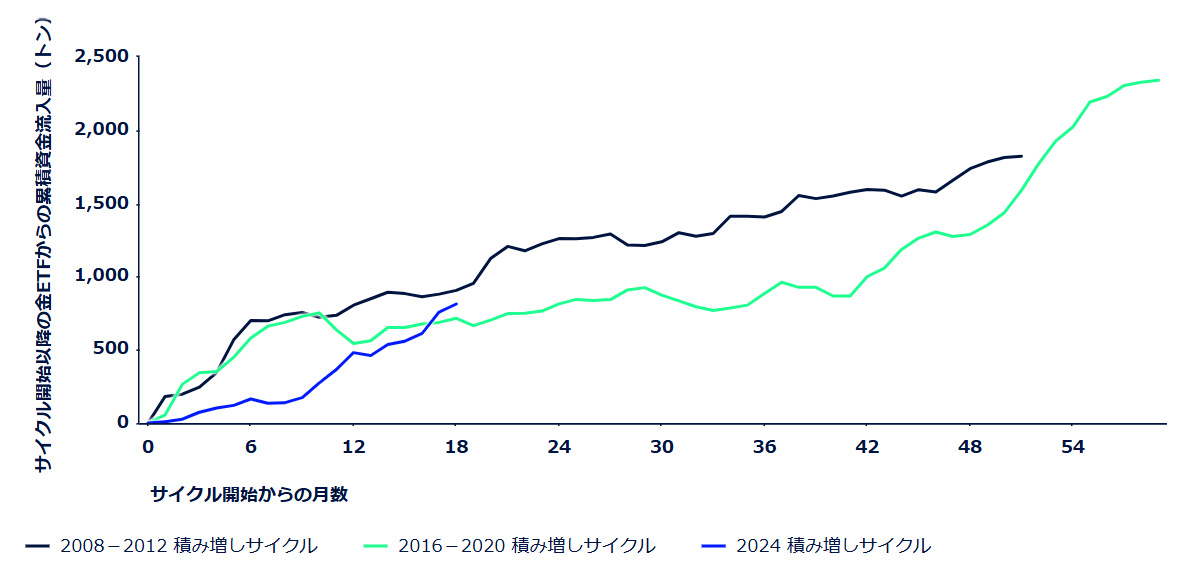 図表5:世界の金ETFの保有量増加サイクル(サイクル開始以降の累計資金流入量)