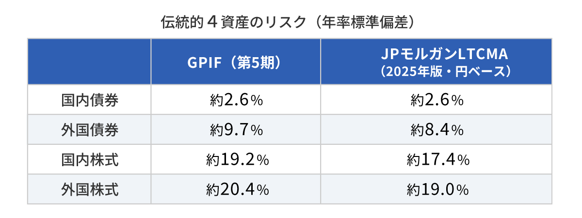 出所:GPIF「第5期中期目標期間における基本ポートフォリオについて」(2025年4月適用)、J.P.モルガン・アセット・マネジメント「LTCMA 2025年版」円建てマトリクス。GPIFの外国債券・外国株式は為替ヘッジなし。JPモルガンの外国債券は先進国国債(除く日本、為替ヘッジなし)、国内株式は日本大型株式、外国株式は世界株式(為替ヘッジなし)。