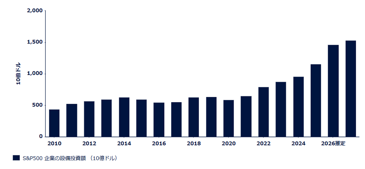 さらに、S&P500企業の設備投資は2024年の9,558億ドルから2027年には1兆5,400億ドル超へ増加すると予想されています(図表2)。AI関連の設備投資によって、データセンター建設から発電・送電機器、先進的冷却システムといったAIインフラ構築を支える実物資産への需要が押し上がり、景気サイクルの加速とともに、資本財や素材といった資産集約型の景気循環セクターへの投資魅力が高まる可能性があります。