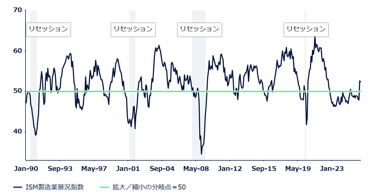 これらのデータを総合すると、米製造業が回復基調にあることが示唆されます。鉱工業生産の伸び率は2025年7月に1.0%(前年同月比)を超えて加速した後も上昇傾向が続き、2026年1月は2.3%増(前年同月比)となりました※2。ISM米製造業購買担当者景気指数(PMI)は足元で52.4と、2ヵ月連続で50超の拡大圏を維持し、2022年以来の高水準に達しています。これは、2022~2025年の米国史上最も長い収縮期を経ての回復です(図表1)。前回のサイクルでは、同指数は2021年3月に63.8でピークを付けました※3。