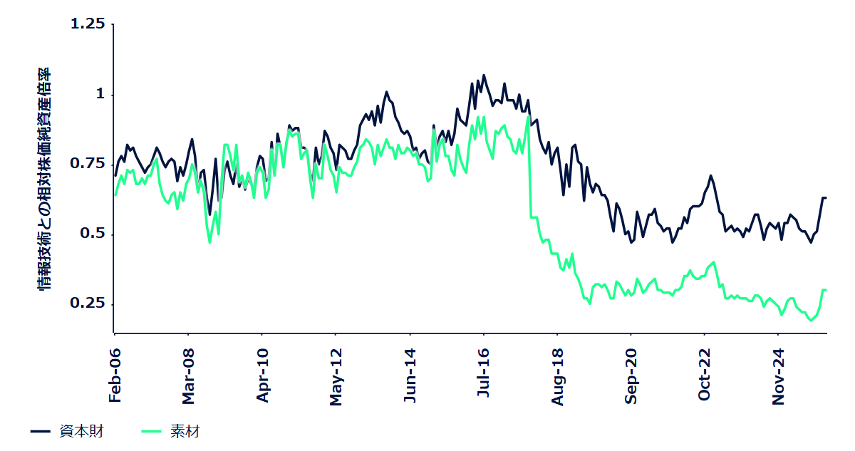 最近の力強いパフォーマンスとファンダメンタルズの改善にもかかわらず、資本財と素材セクターにおける投資家のポジションは依然として低いままです。素材セクターは最もアンダーウェイトされているセクターの一つであり、資本財セクターに対する投資家のポジションもマーケットニュートラルに近い状態にあります※8。両セクターの株価純資産倍率(PBR)は、アセットライト(資産軽量)な情報技術セクターに対して大幅なディスカウントで推移し続けており(図表3)、投資家が実物資産の価値を再評価する中で、バリュエーションが収束する余地が残っています。