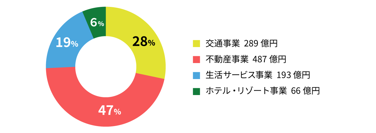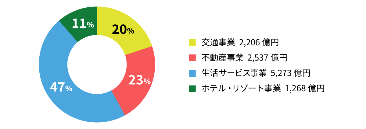 まずひとつ目の「過去最高益の東急」要因を確認していきます。事業ごとの営業収益(売上高)の構成比を確認すると、東急の特徴は、4つの事業で、バランスよく収益を得ているという点です。ただし、後述する営業利益の構成比と異なる部分があります。その大きな違いの1つとしては、営業収益で1番大きな比率を占める事業が、生活サービス事業(東急沿線エリアを中心とした百貨店、スーパーマーケット、ケーブルテレビやでんき・ガス等の家ナカサービス、クレジットカードの発行等)となっている点です。最近は、百貨店はどこも縮小している印象があったので意外に思い、担当者に伺ったところ、東急沿線の住民の日々の生活を支えるスーパーマーケット(東急ストア等)の比率がより高いとのことでした。