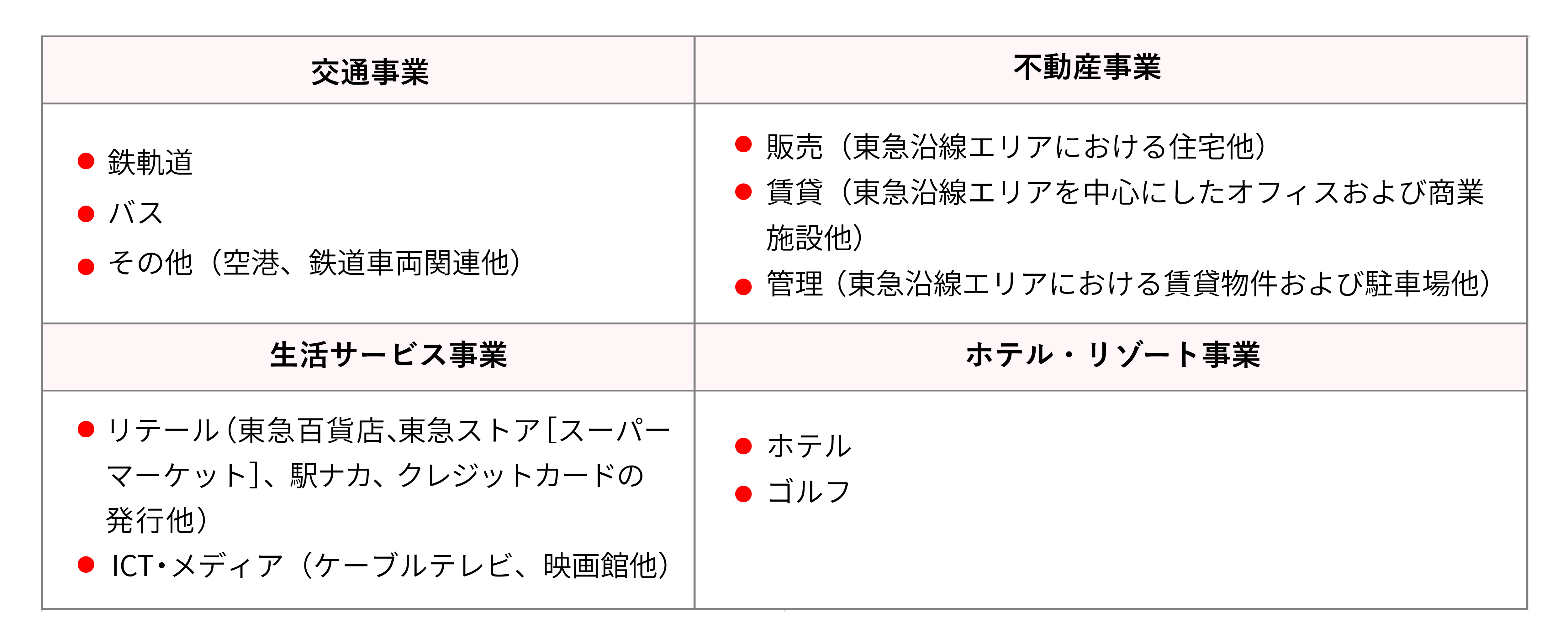 ① 土地開発:英国から日本へと伝わった田園都市論(郊外の住宅地から都心へ電車通勤するスタイル)をもとに、鉄道と不動産一体型のビジネスモデルを世に示した「田園都市株式会社」(1918年に渋沢栄一氏を発起人として設立)と、