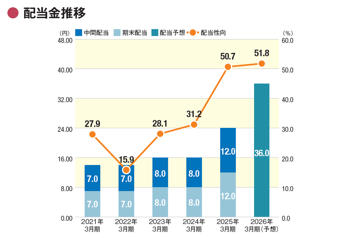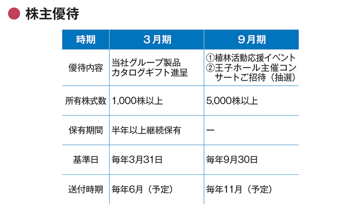 同中計では2027年度にROE(自己資本利益率)を8%まで向上させることを目標に掲げている。この数値は東京証券取引所が要請している「資本コストや株価を意識した経営の実現に向けた対応」で掲げた目安と同じ水準で、さほどインパクトを感じなかった読者もいるだろう。同社のROEは、現在4.3%まで低下しており、大幅な改善を果たすためには、利益の拡大とともにROEの計算で分母となる自己資本の圧縮も不可欠だ。そこで、同社は2027年度までに1200億円の自己株式を取得する計画を打ち出している。併せて、2025年度から株主還元の方針を見直し、配当性向を従来の30%から50%に引上げている。その結果、今期は前期の1株当たり24円から36円と12円の増配となる見通しだ。「グループ製品カタログギフト」(3月期)と「植林活動応援イベント」「王子ホール主催コンサートご招待(抽選)」(9月期)から成る株主優待制度も導入しており、同社の中長期的な成長に期待する個人投資家に広く門戸を開いているといえよう。