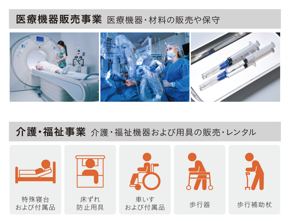 当社グループは、全国の公的医療機関や大学病院を中心に、医療現場に欠かせない医療機器・医療材料を安定的に提供しています。医療用消耗品から最先端医療機器まで、100万点を超える幅広い製品群の中から、現場のニーズや使用環境に応じた最適な提案を行うとともに、販売後の修理・メンテナンスまで一貫して対応しています。