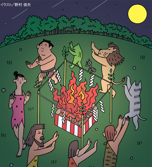 では、時計を逆回しして人類誕生の100万年前に戻って、淘汰されずに生き延びるためにはどんな心のはたらきが必要かを考えてみましょう。当時の人類にとって生き延びるために大事なことは、なんといっても群れで生活すること。狩りをするにも猛獣から身を守るにも、一人ではどうにもなりません。ですから、群れで一体感があるか否かは死命を制する重要事項です。そこで必要になったのが宗教的な儀式。夜な夜なたき火の周りで踊ったり歌ったり、あるいはコーヒーやお酒ももともとは宗教的な儀式に使われたなんて説もあります。現代だって、会社の飲み会で一緒に騒げば一体感が高まります。