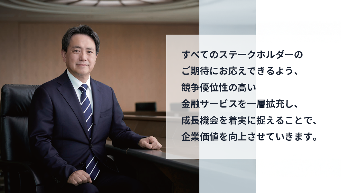 さらには、金融機関の不祥事が相次ぐなか、社会からの信用の維持はこれまで以上に重要性を増しています。私自身、社内で繰り返し話していますが、社会からの信用を維持するためには、日々の業務において適度な緊張感を持つ企業風土の醸成が不可欠です。そのためには、組織としての健全なチェック体制の構築や、オープンにコミュニケーションできる環境整備が不可欠です。特に、マネジメント層が従業員一人ひとりに関心を持ち、積極的にコミュニケーションを深めていくことが重要だと考えています。今後も、成長機会をしっかり捉えるとともに、リスクに正面から向き合い、時代の変化に柔軟かつ果断に対応し、持続的な成長と価値創造をめざして挑戦を続けていきます。