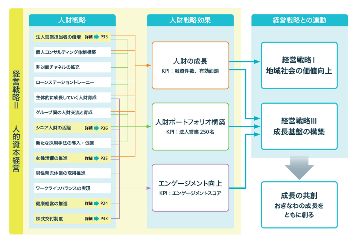 貸出金利息の増強に向けた法人営業担当者の倍増をはじめ、女性活躍推進については、OFGの未来を形作る重要な施策と位置付けています。女性がリーダーシップを発揮できる環境を整えることで、OFGの持続的な成長を支える基盤を強固にしていきたいと考えています。また、OFGでは、職員が安心して長く働ける職場環境の整備に力を入れています。特に、ワークライフバランスの向上を重視し、その取組みの一環としてESOP信託を導入しました。この仕組みにより、離職率の低下を図るとともに、OFG職員が経済的な効果を株主の皆さまと共有し、オーナーシップに満ちた企業文化を醸成することで、企業価値の持続的な向上を図っていきます。