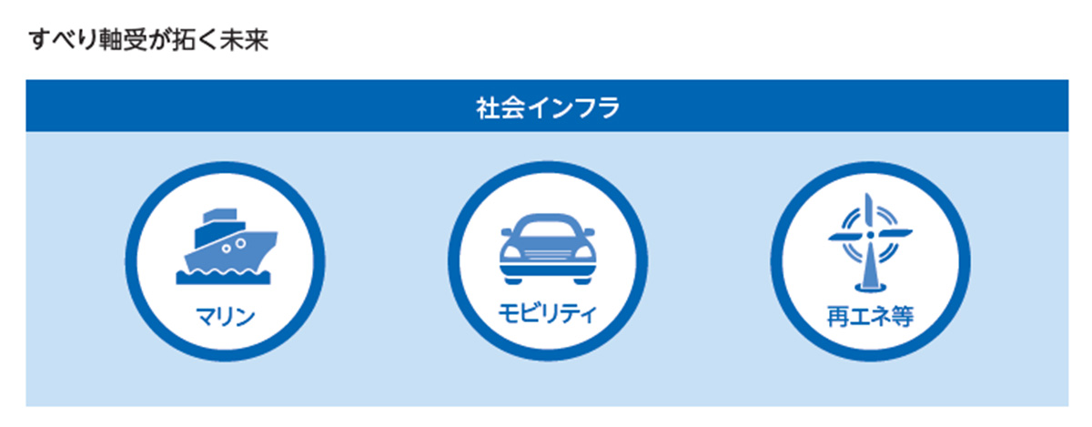 また、再生可能エネルギーの分野でも、需要増が見込まれる風力発電機用軸受の市場開拓に取り組んでいます。現在、一般的な風力発電機(風車)は、直径200メートルにもなるブレードの回転を発電機に伝える軸を支えるため、転がり軸受が使われています。転がり軸受では潤滑用にグリースが用いられていることが多いのですが、グリースは流動特性により潤滑不良が発生すると軸受が故障します。さらに、故障するとブレードを取り外す必要があり、補修費もかかります。