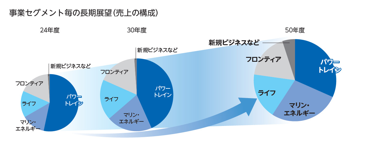 2024年度の事業ポートフォリオでは、パワートレイン事業は約53%を占めていますが、他の事業の伸長により、2030年度には約4割、50年度までには約3割程度になっていく見込みです。全体の売上高を拡大しながら、徐々にパワートレイン事業以外の事業体の売上高を伸ばしていく想定です。