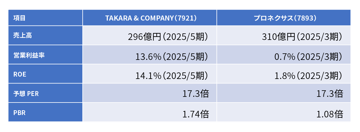 バリュエーション面では、プロネクサスの予想PER17.3倍、PBR1.08倍に対し、TAKARA & COMPANYはPER17.3倍、PBR1.74倍で推移している。PER水準は同等である一方、PBRはTAKARAの方が高く、市場は資本効率の高さに一定のプレミアムを与えている状況だと解釈できる。ただしTAKARA & COMPANYが有するROE14.1%という水準を考えれば、現状のPBR水準は相対的に控えめであり、割安評価が続いているともいえる。