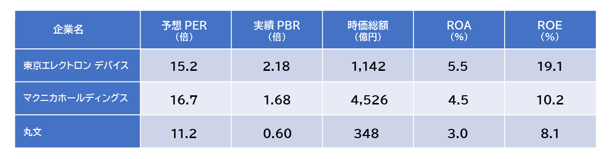 東京エレクトロンデバイス(以下、TED)および比較対象2社であるマクニカホールディングス(以下、マクニカHD)〈3132〉、丸文〈7537〉について、提示された予想PER・実績PBR・時価総額・ROA・ROEの各指標を用い、相対的な評価水準と資本効率を比較する。